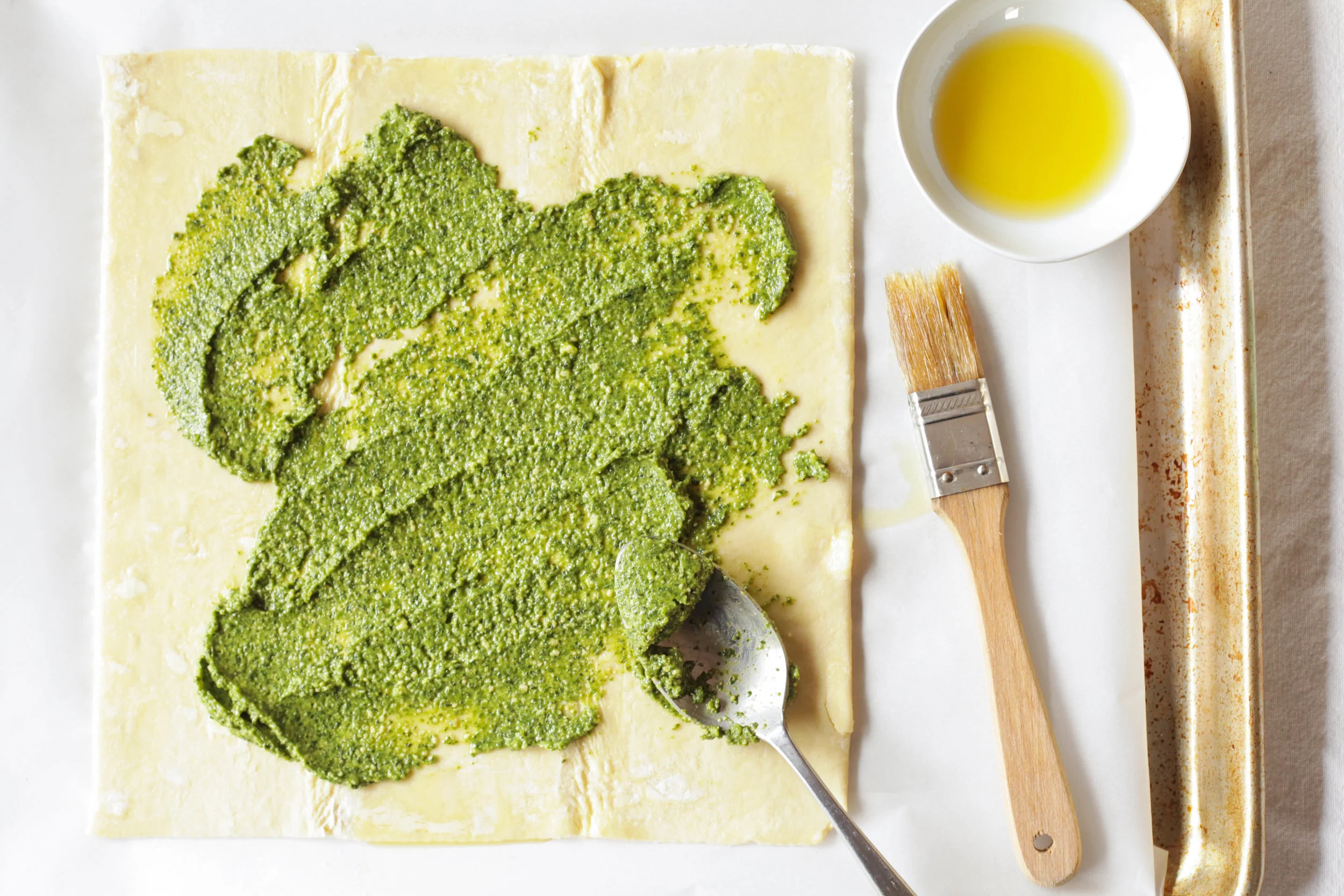 just unfold your puff pastry sheets, brush with olive oil, spread pesto, add prosciutto, sprinkle parmesan, twist, and bake!
